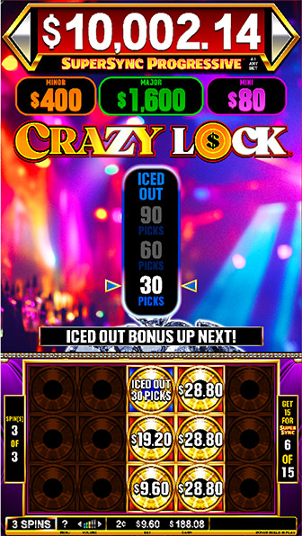 Golden record scatters may increase the Lock N Spin Bonus vault or trigger the bonus! Six locked scatters guarantee a bonus event. Players begin a classic Lock N Spin bonus, beginning with three spins and resetting the spin count with every locked scatter. Filling up the 3x15 grid awards the SuperSync Progressive™! Iced Out diamond scatters may land during the bonus – these collect in a meter overhead. With enough diamond scatters, players can trigger a SECOND bonus! Bonus-within-a-bonus action takes this Lock & Spin to the next level.